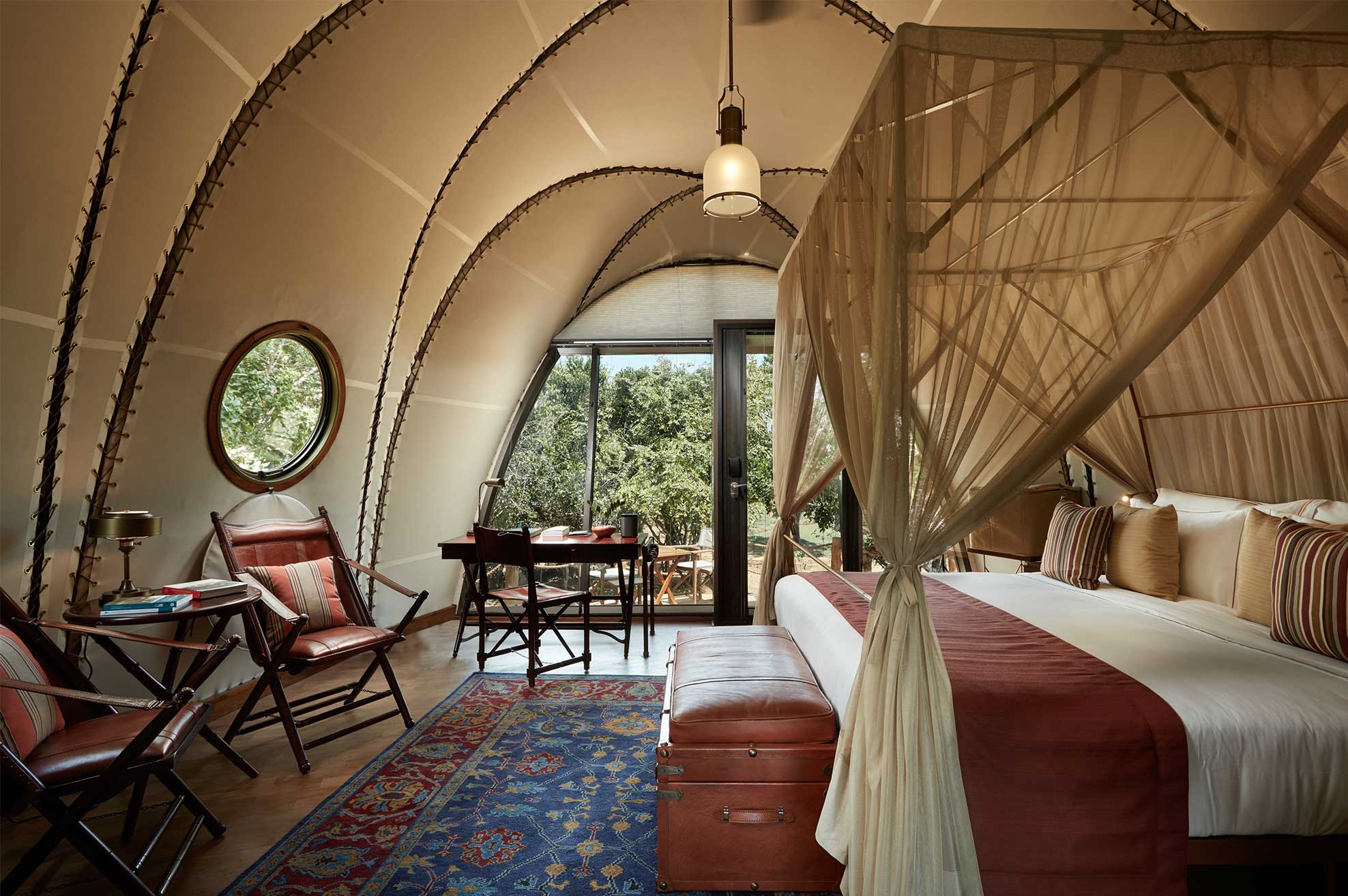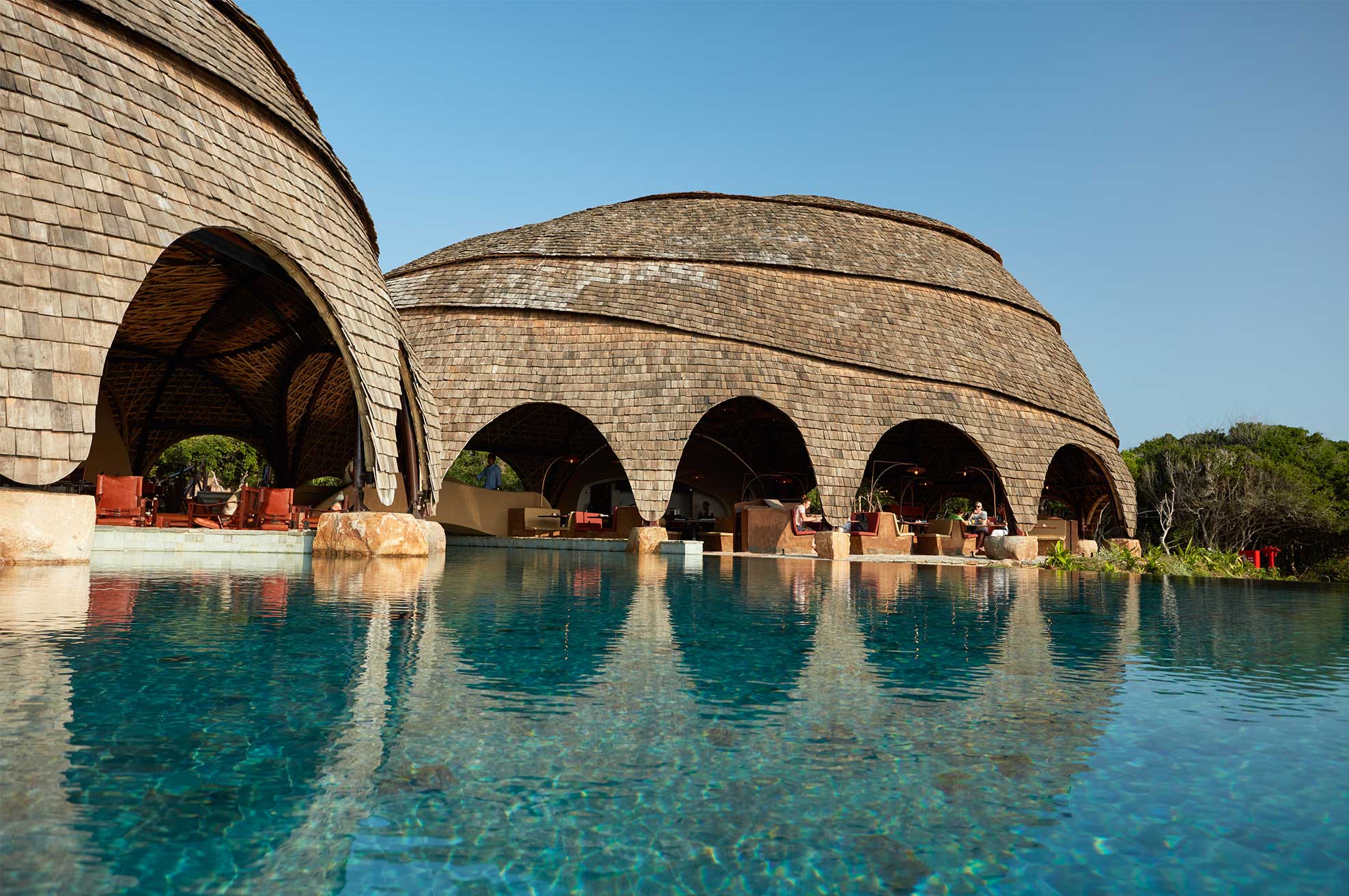 Wild Coast Tented Lodge’s unique design, masterminded by a consortium of Dutch, English and Sri Lankan designers, sees the man-made structures blending seamlessly into the surrounding landscape thanks to the use of carefully selected natural materials. The use of arched fabric structures allows each of the twenty eight cocoon tents to take on the shape and colour of the rocks and boulders that lay scattered nearby, whilst a clever layout in the shape of a leopard’s paw print alludes to the area’s most famous resident.